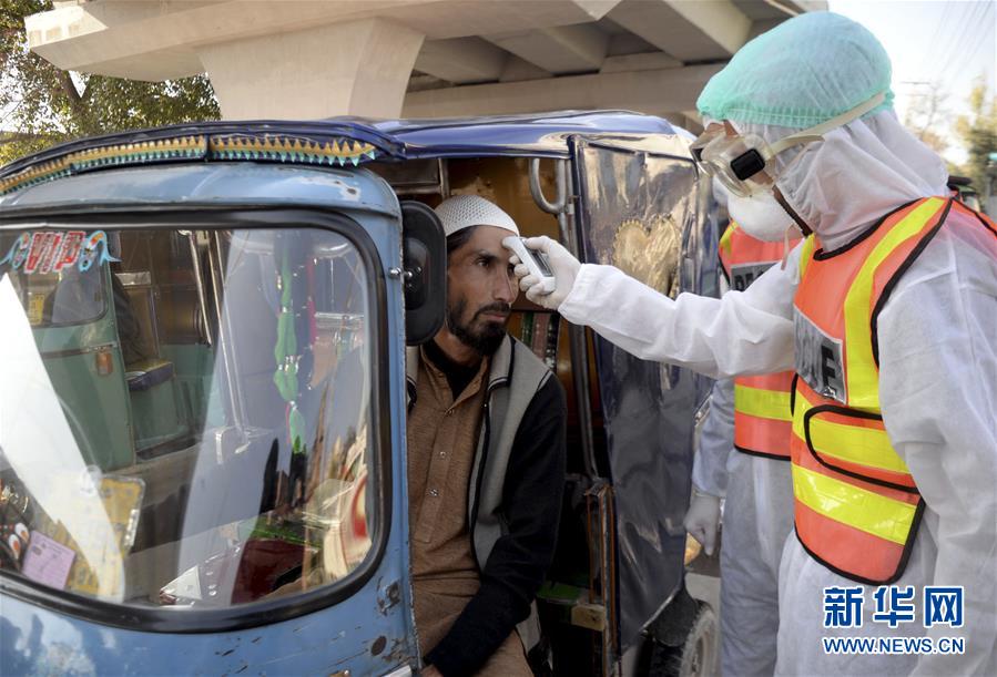 3月2日,在巴基斯坦西北部城市白沙瓦,参加新冠肺炎疫情防控演练的人员为一名男子测量体温。