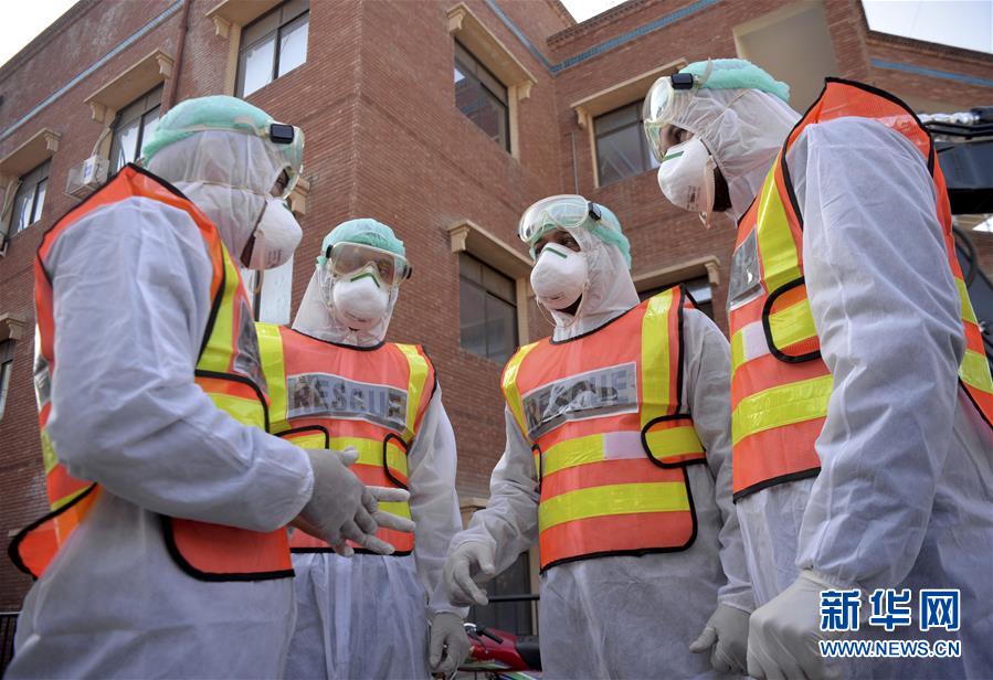 当日,巴基斯坦白沙瓦开展应对新冠肺炎疫情的防控演练。 新华社发(奥马尔·卡尤姆摄)