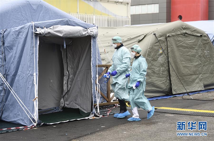 3月3日,在意大利布雷西亚,医务人员在医院外搭建的帐篷中工作。 截至当地时间3月3日下午6点,意大利的新冠肺炎累计确诊病例增至2263例。意大利已经对北部出现确诊病例的若干城镇采取了封闭措施。同时,各地医院外搭建临时帐篷,方便分流、诊断和隔离。 新华社发