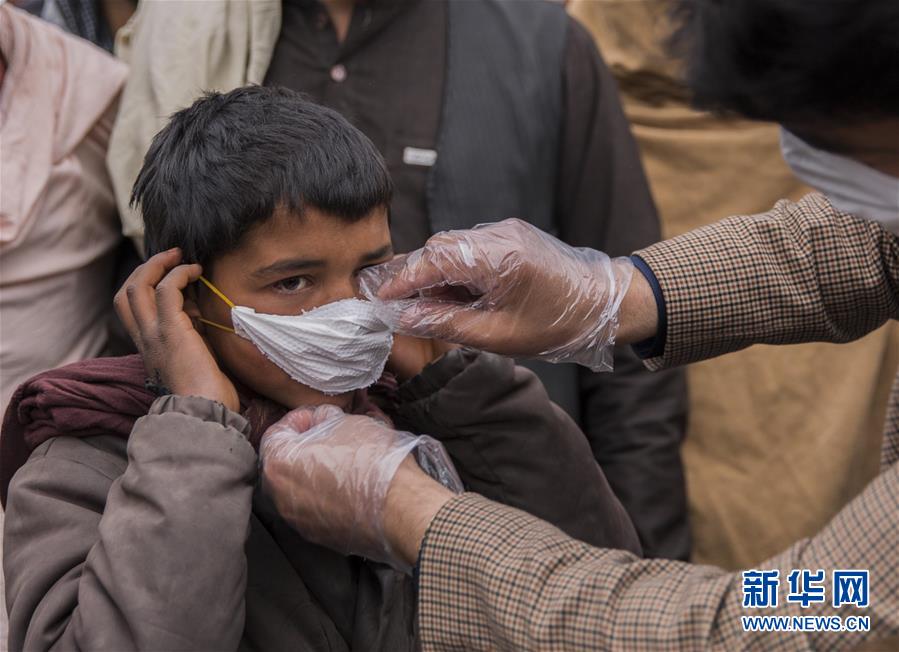 2月24日阿富汗宣布赫拉特省出现了该国首个确诊病例。这是2月26日,在阿富汗赫拉特省,一名男子为当地民众分发口罩。 新华社发(埃拉哈·萨赫勒摄)
