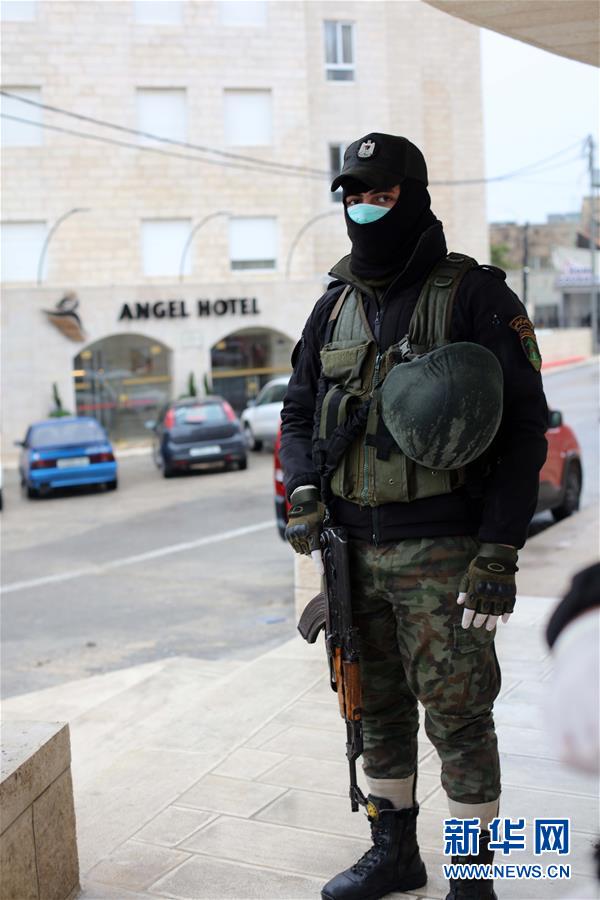 3月6日,巴勒斯坦警察在约旦河西岸城市伯利恒的“天使旅馆”外执勤。 5日,中东地区的巴勒斯坦首次确诊7例新冠肺炎病例。巴勒斯坦卫生部长马伊·凯拉介绍,一个希腊旅游团2月23日至27日入住约旦河西岸城市伯利恒的“天使旅馆”,该团回国后部分成员新冠病毒检测呈阳性。巴勒斯坦医疗人员对与该旅游团有过密切接触的20名旅馆雇员进行病毒检测后确认,有7人感染。7名患者目前在约旦河西岸城市杰里科一处隔离中心接受治疗。 新华社发