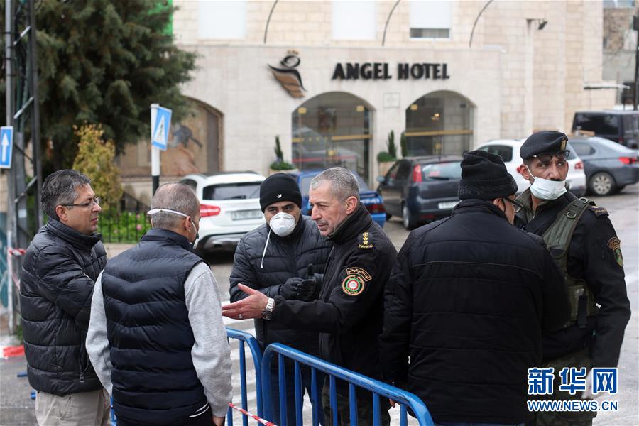 3月6日,巴勒斯坦警察佩戴口罩在约旦河西岸城市伯利恒的“天使旅馆”外执勤。 5日,中东地区的巴勒斯坦首次确诊7例新冠肺炎病例。巴勒斯坦卫生部长马伊·凯拉介绍,一个希腊旅游团2月23日至27日入住约旦河西岸城市伯利恒的“天使旅馆”,该团回国后部分成员新冠病毒检测呈阳性。巴勒斯坦医疗人员对与该旅游团有过密切接触的20名旅馆雇员进行病毒检测后确认,有7人感染。7名患者目前在约旦河西岸城市杰里科一处隔离中心接受治疗。 新华社发