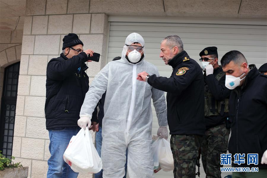 3月6日,巴勒斯坦警察和防疫人员在约旦河西岸城市伯利恒的“天使旅馆”外执勤。 5日,中东地区的巴勒斯坦首次确诊7例新冠肺炎病例。巴勒斯坦卫生部长马伊·凯拉介绍,一个希腊旅游团2月23日至27日入住约旦河西岸城市伯利恒的“天使旅馆”,该团回国后部分成员新冠病毒检测呈阳性。巴勒斯坦医疗人员对与该旅游团有过密切接触的20名旅馆雇员进行病毒检测后确认,有7人感染。7名患者目前在约旦河西岸城市杰里科一处隔离中心接受治疗。 新华社发