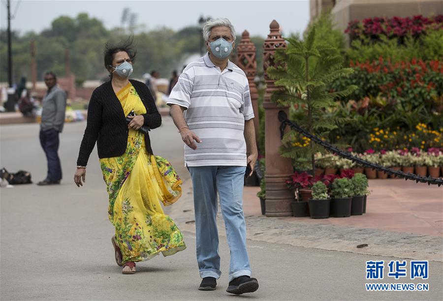 这是3月6日在印度新德里拍摄的戴口罩的行人。 近日,印度民众加强防控措施应对新冠肺炎疫情。 新华社发(贾韦德·达尔 摄)