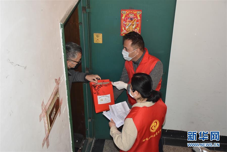 3月6日,哈米(中)向一名外籍住户发送防疫物资。新华社记者 郑梦雨 摄