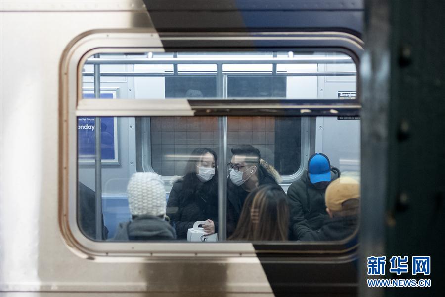 这是3月7日在美国纽约曼哈顿时报广场地铁站拍摄的戴口罩的乘客。 新华社记者 李木子 摄