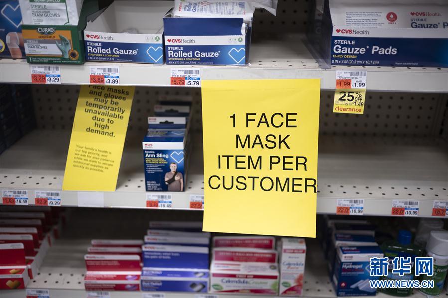 3月7日,美国纽约曼哈顿一家药店内贴着口罩限量销售的告示。 新华社记者 李木子 摄