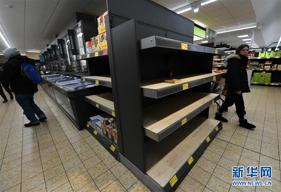 3月9日,在德国法兰克福一家超市,人们从空货架旁走过。 新华社记者 逯阳 摄