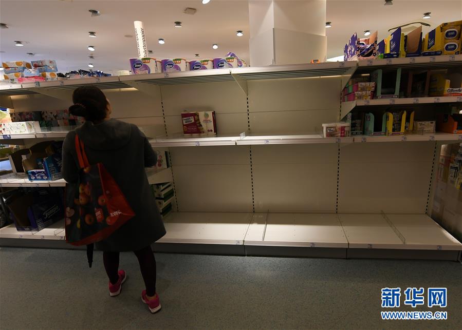 3月9日,在德国法兰克福一家超市,一名女士从空货架旁走过。 新华社记者 逯阳 摄