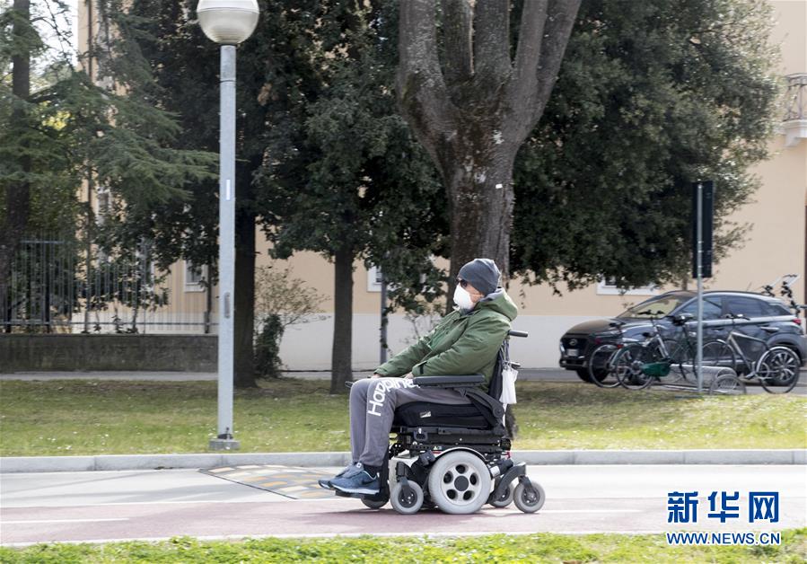 3月9日,在意大利里米尼,一名男子戴着口罩。 意大利总理孔特9日晚发表电视讲话说,为避免新冠肺炎疫情进一步扩散,自10日起在全国范围内实施封城。除可证明的工作、健康和紧急需求三种特殊原因,全国范围内的民众不得擅自离开所在地。 新华社发(埃莉萨·林格里亚摄)