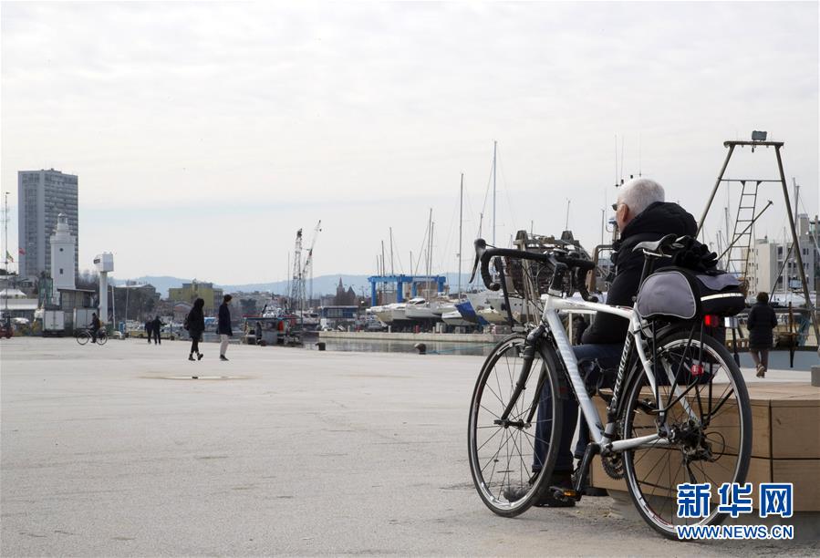 3月9日,在意大利里米尼,一名老人坐在路边。 意大利总理孔特9日晚发表电视讲话说,为避免新冠肺炎疫情进一步扩散,自10日起在全国范围内实施封城。除可证明的工作、健康和紧急需求三种特殊原因,全国范围内的民众不得擅自离开所在地。 新华社发(埃莉萨·林格里亚摄)