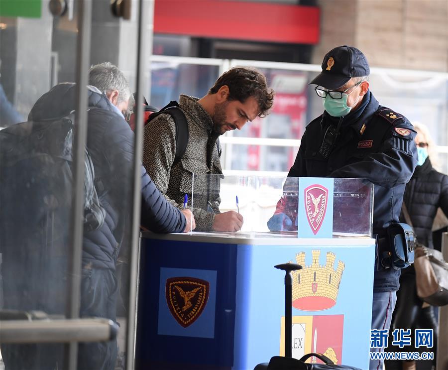 3月9日,在意大利罗马泰尔米尼火车站,警察询问旅客出行信息。 意大利总理孔特9日晚发表电视讲话说,为避免新冠肺炎疫情进一步扩散,自10日起在全国范围内实施封城。除可证明的工作、健康和紧急需求三种特殊原因,全国范围内的民众不得擅自离开所在地。 新华社发(阿尔贝托·林格利亚摄)