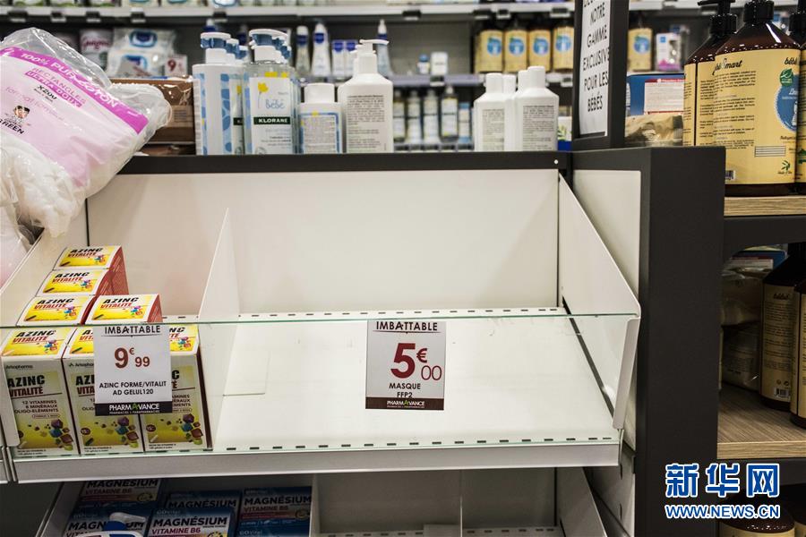 3月9日,在法国东北部城市梅斯,一家药店内的FFP2口罩售罄。 法国卫生部官员9日说,法国当天新增新冠肺炎确诊病例286例,全国确诊病例升至1412例。 新华社发(马丁·勒列夫尔摄)