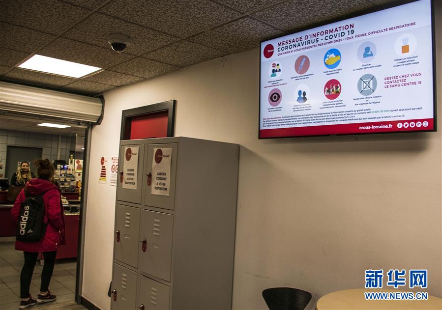 3月9日,在法国东北部城市梅斯,一所大学内电子屏显示出现疑似新冠病毒感染症状后的应对方法。 法国卫生部官员9日说,法国当天新增新冠肺炎确诊病例286例,全国确诊病例升至1412例。 新华社发(马丁·勒列夫尔摄)
