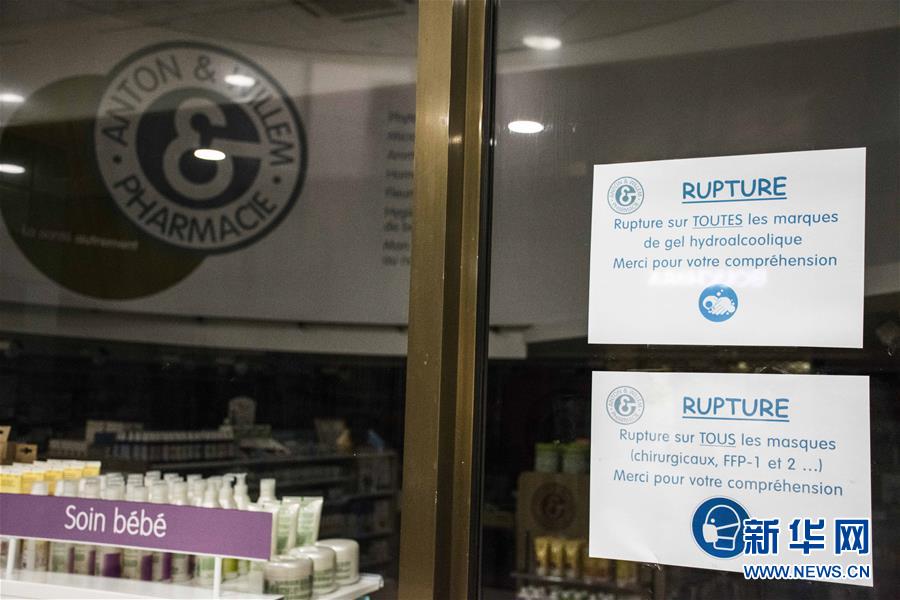 3月9日,在法国东北部城市梅斯,一家药店外张贴着“口罩及免洗洗手液售罄”的告示。 法国卫生部官员9日说,法国当天新增新冠肺炎确诊病例286例,全国确诊病例升至1412例。 新华社发(马丁·勒列夫尔摄)