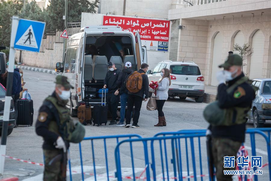 3月9日,在约旦河西岸城市伯利恒郊外拜特贾拉镇,来自美国的游客离开出现新冠肺炎确诊病例的“天使旅馆”。新华社发(卢埃·萨巴巴摄)