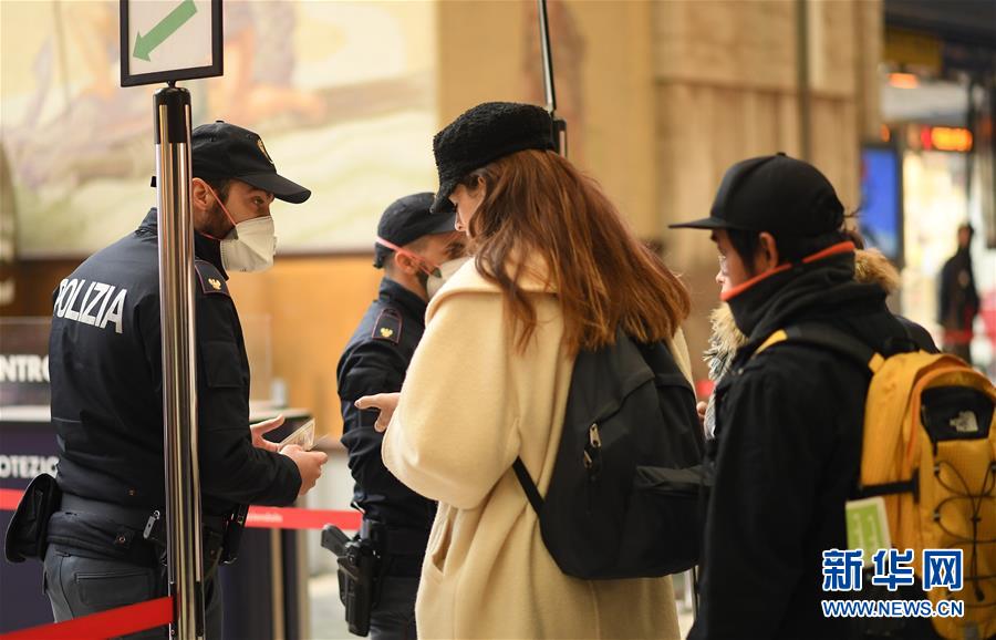 3月9日,在意大利米兰中央火车站,戴口罩的警察询问旅客出行信息。新华社发(达尼埃莱·马斯科洛摄)