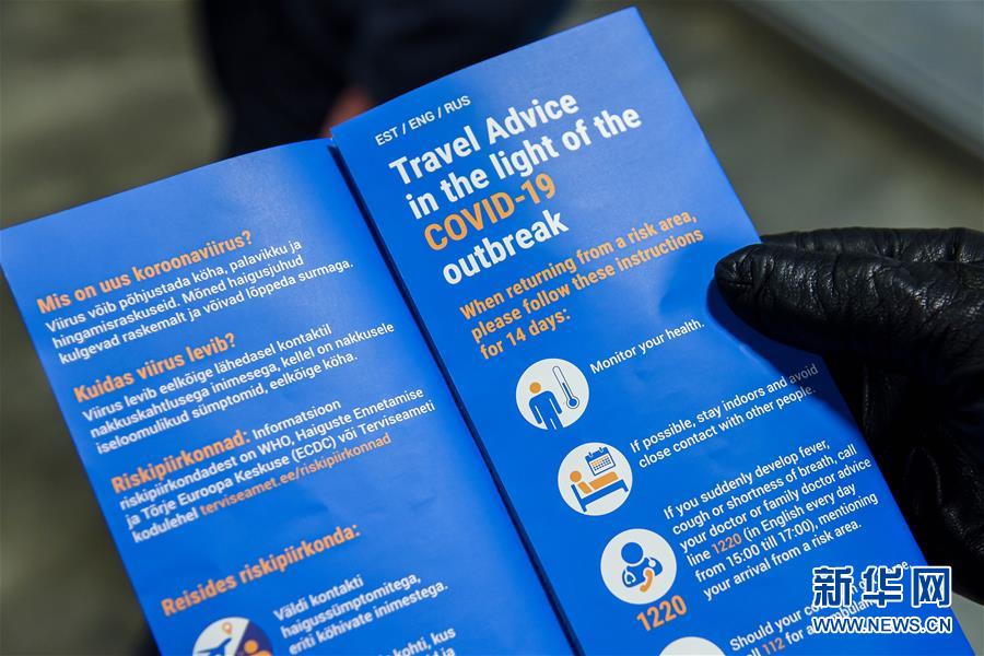 这是3月9日在爱沙尼亚纳尔瓦的边境检查站拍摄的新冠肺炎防疫信息传单。 自6日以来,所有爱沙尼亚边境检查站均提供新冠肺炎防疫信息并检查过境者的体温。爱沙尼亚警察和边防局按照卫生局的要求在边境检查站等场所分发传单,以普及新型冠状病毒的防疫信息。 新华社发(谢尔盖·斯捷潘诺夫摄)