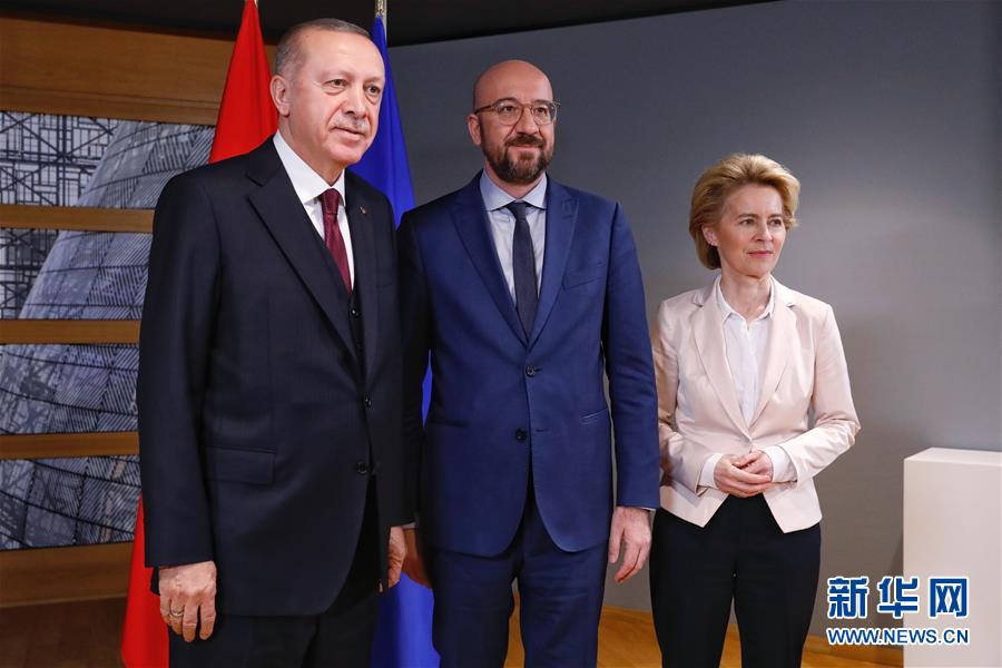 3月9日,在比利时布鲁塞尔的欧盟总部,土耳其总统埃尔多安(左)、欧洲理事会主席米歇尔(中)和欧盟委员会主席冯德莱恩在会谈前合影。 欧盟委员会主席冯德莱恩和欧洲理事会主席米歇尔9日在布鲁塞尔与到访的土耳其总统埃尔多安举行会谈,商讨如何解决当前土耳其与希腊边境出现的难民问题。 新华社发