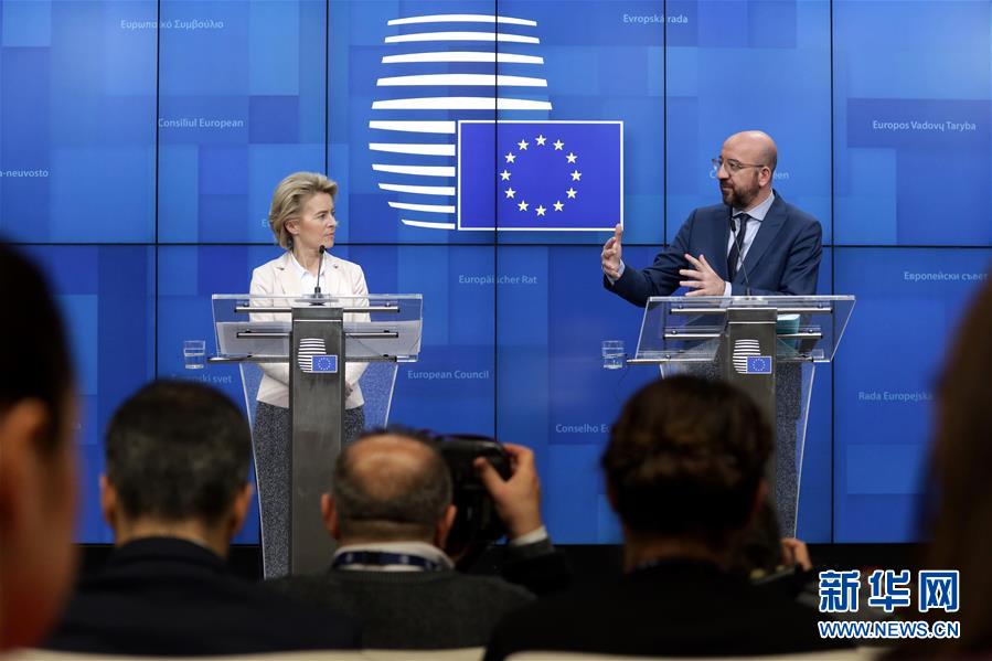 3月9日,在比利时布鲁塞尔的欧盟总部,欧洲理事会主席米歇尔(右)和欧盟委员会主席冯德莱恩出席新闻发布会。 欧盟委员会主席冯德莱恩和欧洲理事会主席米歇尔9日在布鲁塞尔与到访的土耳其总统埃尔多安举行会谈,商讨如何解决当前土耳其与希腊边境出现的难民问题。 新华社发