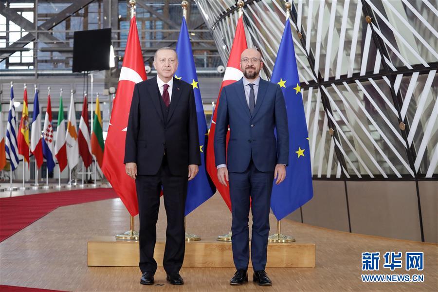 3月9日,在比利时布鲁塞尔的欧盟总部,土耳其总统埃尔多安(左)和欧洲理事会主席米歇尔在会谈前合影。 欧盟委员会主席冯德莱恩和欧洲理事会主席米歇尔9日在布鲁塞尔与到访的土耳其总统埃尔多安举行会谈,商讨如何解决当前土耳其与希腊边境出现的难民问题。 新华社发