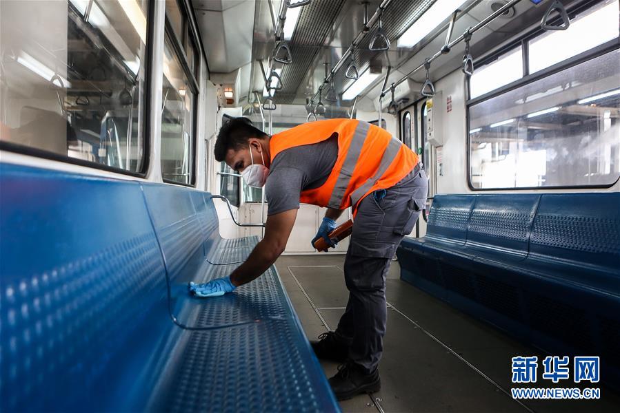 3月10日,在菲律宾奎松城,工作人员为地铁列车消毒。 菲律宾总统杜特尔特9日晚表示,菲律宾当天新增4例新冠肺炎确诊病例,目前累计确诊病例24例。 新华社发(乌马利摄)