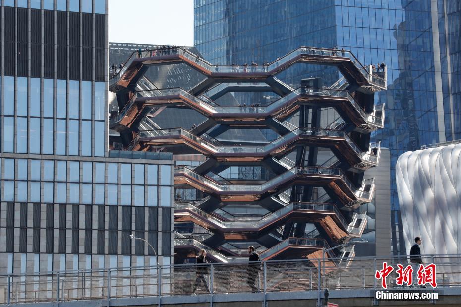 当地时间3月9日,纽约民众在哈德逊城市广场附近散步。哈德逊城市广场中的纽约标志性建筑“大松果”(The Vessel)和游人一同沐浴在阳光下。中新社记者 廖攀 摄