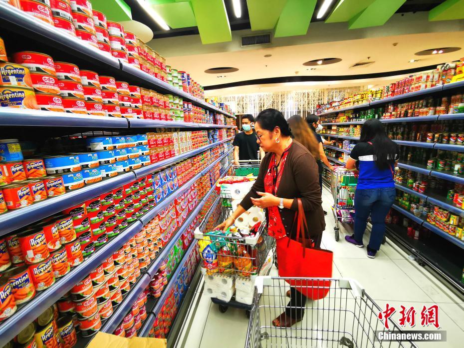 3月10日,位于马尼拉CBD马卡蒂的LANDMARK生活超市,不少家庭成箱购买食物和日用品,其中少不了食品罐头。因应新冠肺炎疫情在菲出现本地传播迹象,菲律宾总统杜特尔特9日宣布全菲进入公共卫生紧急状态。中新社记者 关向东 摄