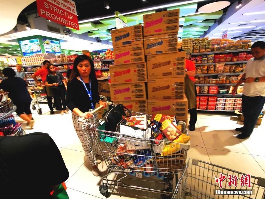 3月10日,位于马尼拉CBD马卡蒂的LANDMARK生活超市,不少家庭成车购买食物和生活用品,商场工作人员则不停补货。因应新冠肺炎疫情在菲出现本地传播迹象,菲律宾总统杜特尔特9日宣布全菲进入公共卫生紧急状态。中新社记者 关向东 摄