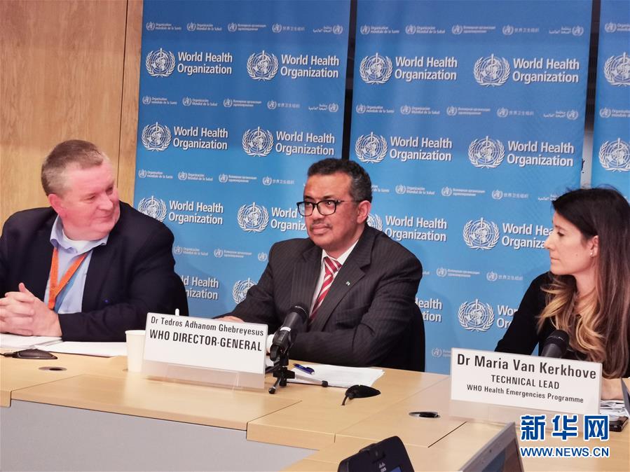 3月11日,在瑞士日内瓦,世界卫生组织总干事谭德塞(中)出席新闻发布会。 当日,世界卫生组织总干事谭德塞说,新冠肺炎疫情已具有大流行特征。 新华社记者陈俊侠摄