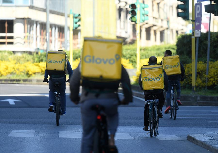 新华社照片,米兰(意大利),2020年3月11日 (国际疫情)(4)意大利新冠肺炎确诊病例升至12462例 3月11日,外卖送餐员在意大利米兰街头忙碌。 意大利民事保护部门负责人、新冠病毒应急委员会专员博雷利11日说,截至当地时间当天18时,意大利累计新冠肺炎确诊病例12462例。 新华社发(达尼埃莱·马斯科洛摄)