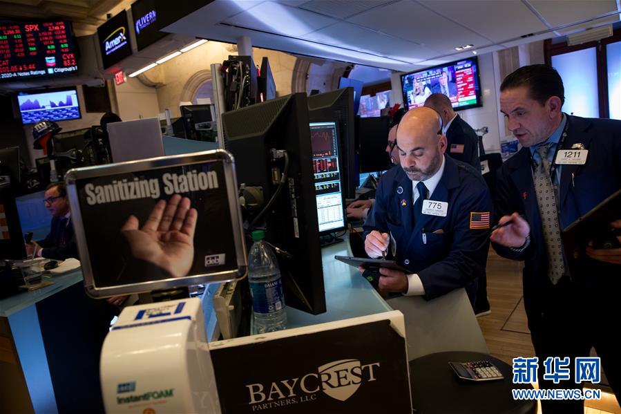3月11日,交易员在美国纽约证券交易所工作,旁边摆放着消毒洁手器。 纽约股市三大股指11日暴跌。截至当天收盘,道琼斯工业平均指数下跌1464.94点,收于23553.22点,跌幅为5.86%。标准普尔500种股票指数下跌140.85点,收于2741.38点,跌幅为4.89%。纳斯达克综合指数下跌392.20点,收于7952.05点,跌幅为4.70%。 新华社发(郭克摄)
