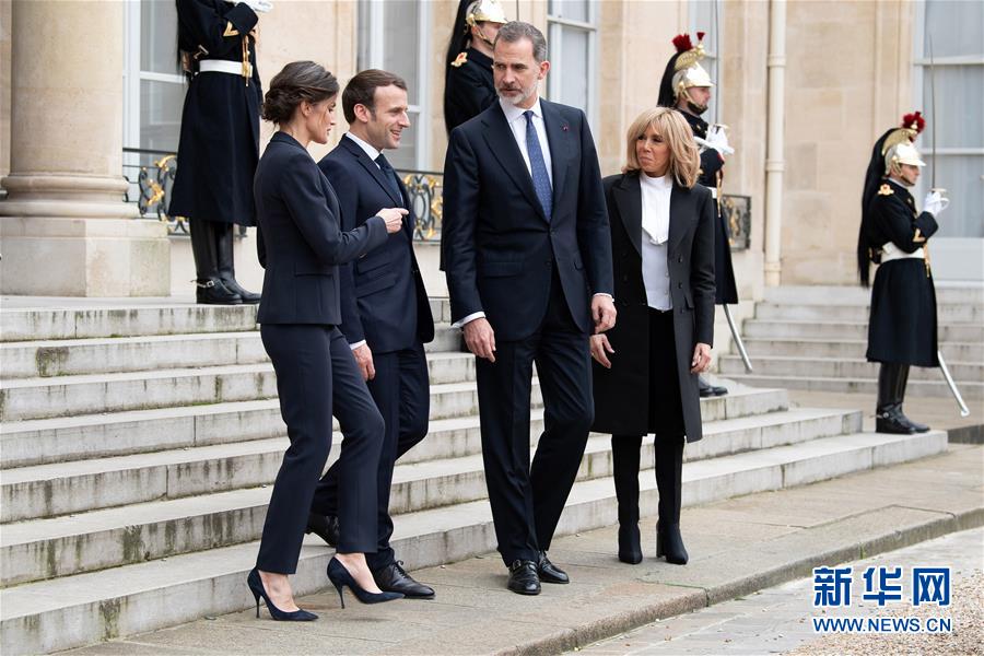 3月11日,在法国巴黎总统府爱丽舍宫,法国总统马克龙(左二)和夫人布里吉特·马克龙(右一)迎接来访的西班牙国王费利佩六世(右二)和王后莱蒂西娅。新华社发(杰克·陈摄)