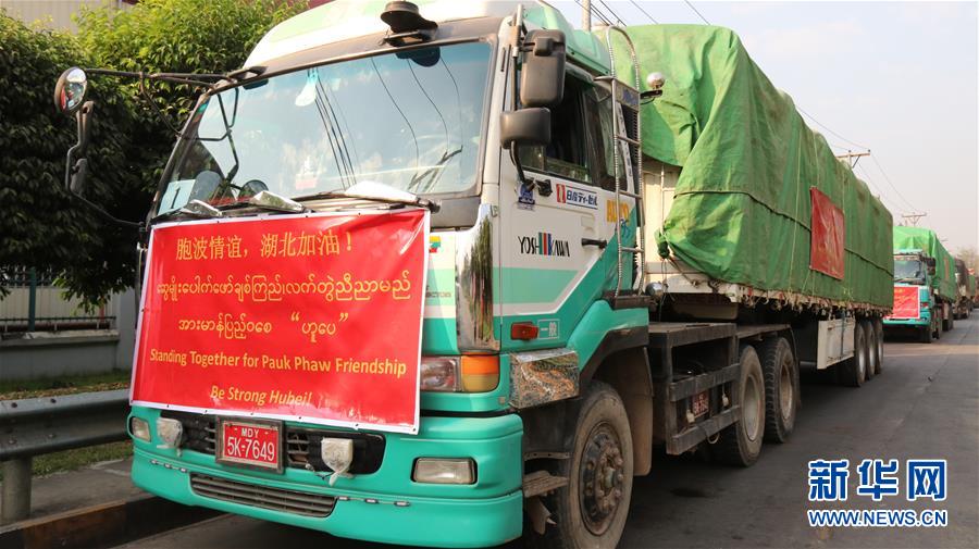 3月1日,在缅甸仰光瑞比达工业园区,装满捐赠大米的车辆排成一排,车上挂着“胞波情谊,湖北加油”的标语。为支援中国抗击新冠肺炎疫情,缅甸通过中国驻缅甸大使馆向中国捐赠200吨大米。 新华社记者 张东强 摄