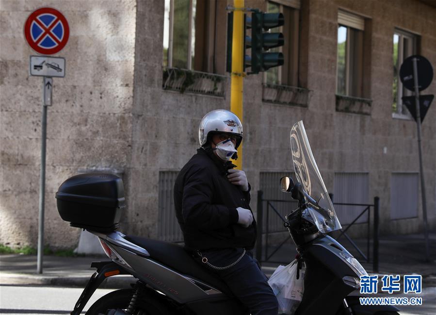 3月12日,在意大利首都罗马,一名男子戴口罩出行。 意大利总理孔特11日晚宣布,关闭全国除食品店和药店以外的所有商铺,以防止新冠肺炎疫情进一步蔓延。 新华社记者程婷婷摄