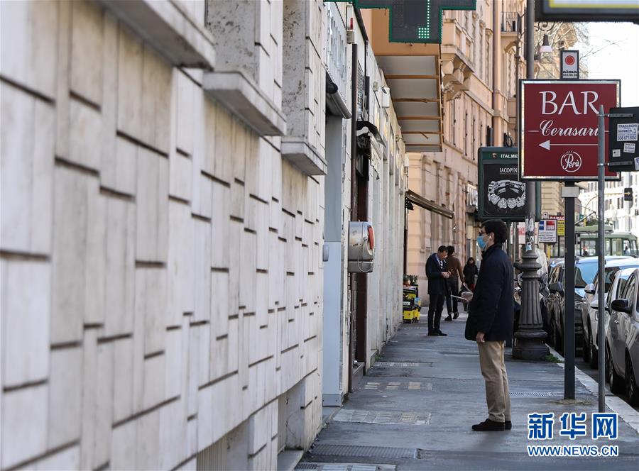 3月12日,在意大利首都罗马,一名戴口罩的男子在药店外排队。 意大利总理孔特11日晚宣布,关闭全国除食品店和药店以外的所有商铺,以防止新冠肺炎疫情进一步蔓延。 新华社记者程婷婷摄