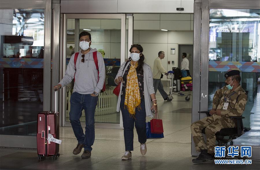 3月12日,在印度新德里英迪拉·甘地国际机场,人们戴口罩走出大厅。 印度政府11日晚宣布,从3月13日至4月15日,除外交等部分人员外,印度暂不允许其他持有效签证者入境。 新华社发(贾韦德·达尔摄)