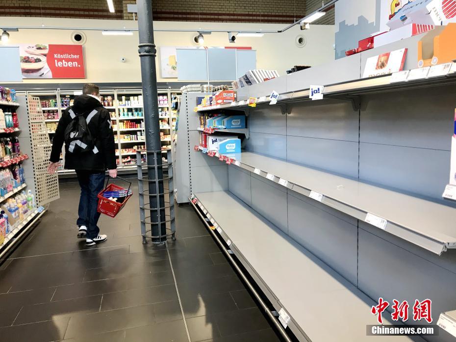 当地时间3月12日,德国柏林市中心一家大型超市,一名顾客经过被抢购一空的厕纸货架。随着疫情不断发展,德国也开始出现厕纸和口罩、消毒液等物资被恐慌性抢购的现象。中新社记者 彭大伟 摄