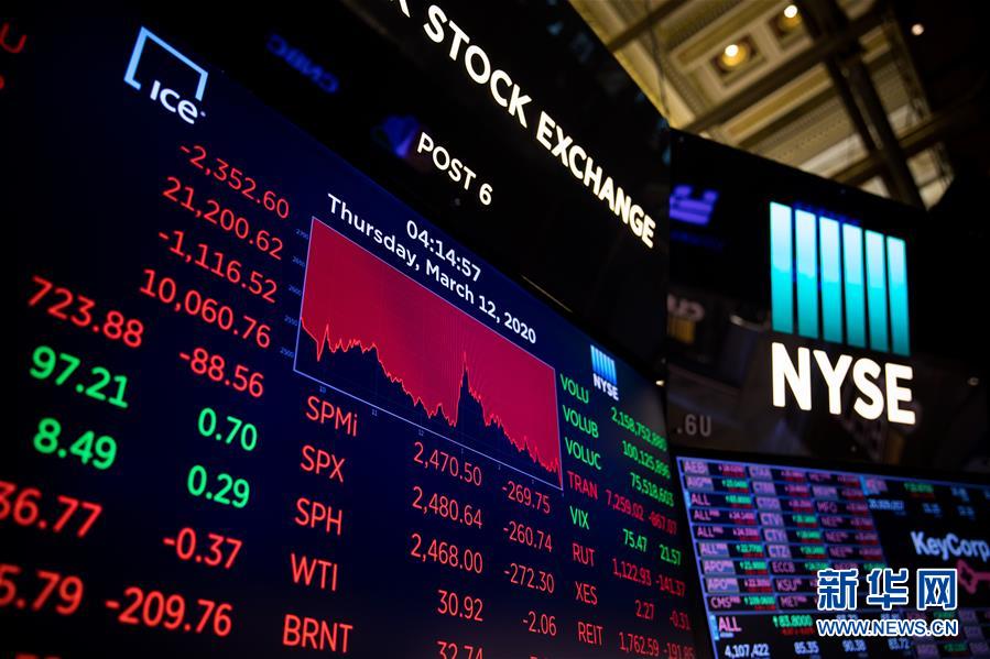 3月12日,美国纽约证券交易所的电子屏显示当天交易情况。 纽约股市三大股指12日暴跌超9%。纽约股市三大股指当天开盘出现暴跌,跌幅超过7%。暴跌行情导致美股再次触发熔断机制,暂停交易15分钟。截至当天收盘,道琼斯工业平均指数下跌2352.60点,收于21200.62点,跌幅为9.99%,创下1987年以来的最大单日下跌点数。标准普尔500种股票指数下跌260.74点,收于2480.64点,跌幅为9.51%。纳斯达克综合指数下跌750.25点,收于7201.80点,跌幅为9.43%。 新华社发