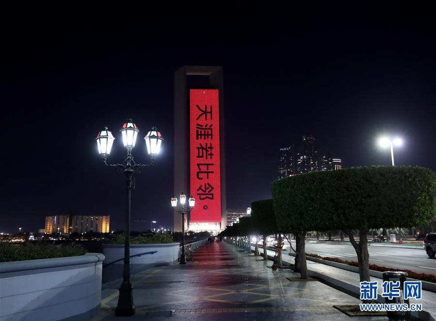 3月12日,在阿联酋阿布扎比,当地地标建筑物阿布扎比国家石油公司大楼显示出“天涯若比邻”的中文字样。 当日,阿联酋阿布扎比的地标建筑物阿布扎比国家石油公司大楼亮灯显示中国国旗和“中国必胜”、“海内存知己,天涯若比邻”中文字样,表达对中国战胜新冠肺炎疫情的信心和支持。这是阿联酋继今年2月2日以来,第二次以这种方式为中国抗击疫情加油。 新华社/阿联酋通讯社