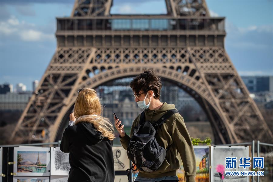 3月12日,在法国巴黎,一名游客戴口罩在人权广场上观光游览。