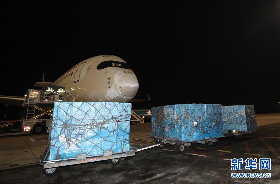3月12日,在意大利首都罗马,机场工作人员将中方捐助的医疗物资运下飞机。