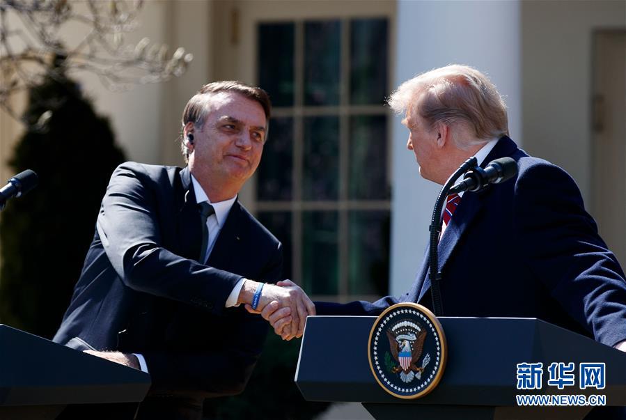 这是2019年3月19日,在美国首都华盛顿,巴西总统博索纳罗(左)同美国总统特朗普在白宫玫瑰园举行联合记者会时握手。 2020年3月13日巴西总统博索纳罗在社交媒体上宣布,他本人新冠病毒检测结果呈阴性。 新华社发(沈霆摄)