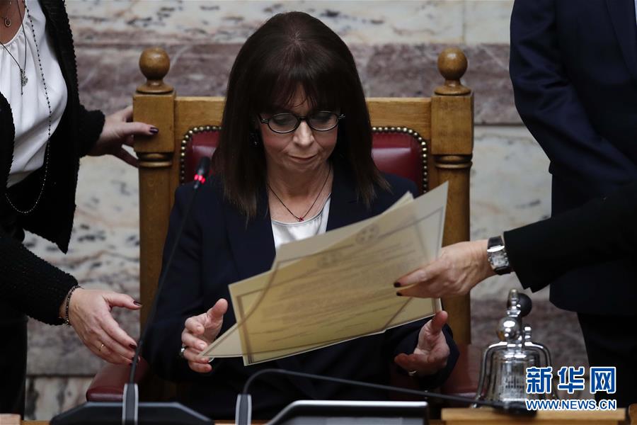 这是3月13日在希腊雅典议会宣誓就职仪式现场拍摄的希腊当选总统卡特里娜·萨克拉罗普卢。 希腊当选总统卡特里娜·萨克拉罗普卢13日宣誓就职,接替前总统帕夫洛普洛斯,成为希腊历史上首位女总统。 新华社发(阿尔基斯摄)