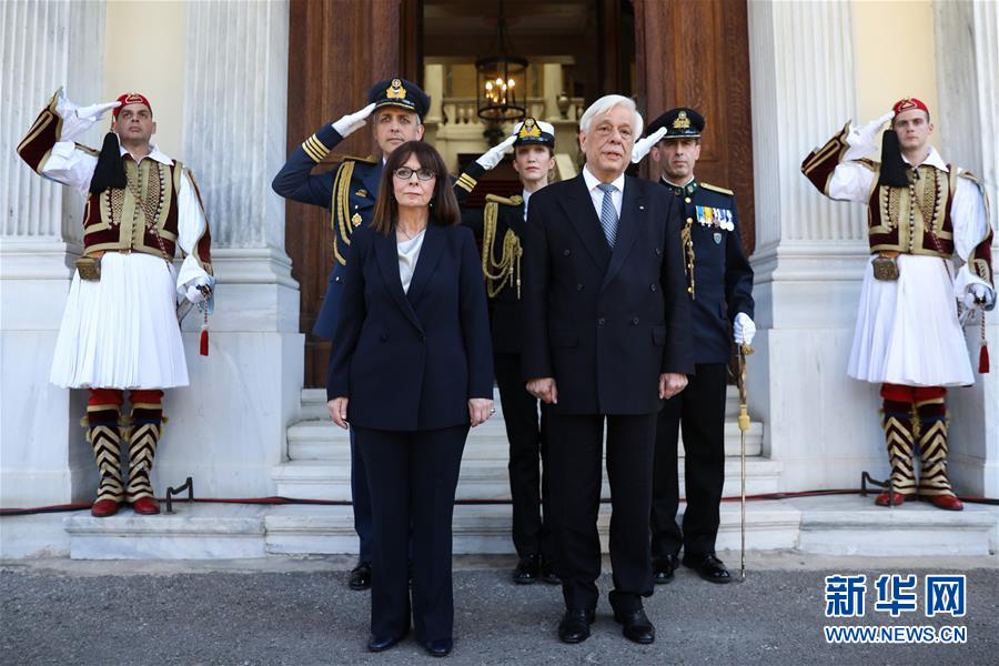 这是3月13日在希腊雅典总统府拍摄的参加完就职仪式的希腊当选总统卡特里娜·萨克拉罗普卢(前左)和前总统帕夫洛普洛斯(前右)。 希腊当选总统卡特里娜·萨克拉罗普卢13日宣誓就职,接替前总统帕夫洛普洛斯,成为希腊历史上首位女总统。 新华社发(阿尔基斯摄)