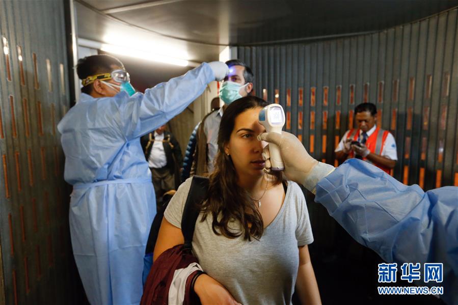 这张由秘鲁卫生部提供的照片显示的是3月12日,在秘鲁卡亚俄,医务人员在机场检测旅客的体温。 新华社发