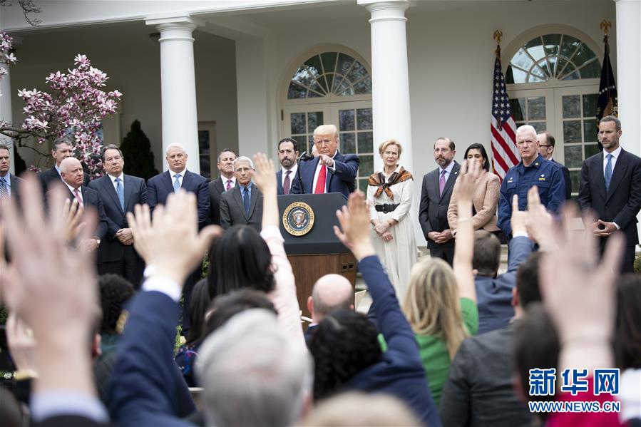 3月13日,在美国华盛顿白宫,美国总统特朗普(中)出席记者会。 特朗普当天下午在白宫发表讲话时正式宣布“国家紧急状态”。他说,此举旨在让美国联邦政府全力投入到抗击新冠肺炎疫情的努力中。这项举措将释放500亿美元资金,帮助各州和地方政府应对疫情。 新华社记者刘杰摄