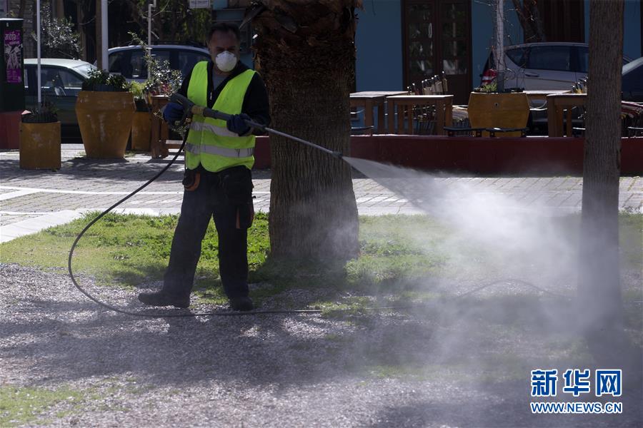 3月14日,在希腊首都雅典,工作人员进行消毒防疫。 世界卫生组织15日发布的最新数据显示,全球新冠肺炎病例累计已超过15万,达到152428例。 新华社发(马里奥斯·罗洛斯 摄)