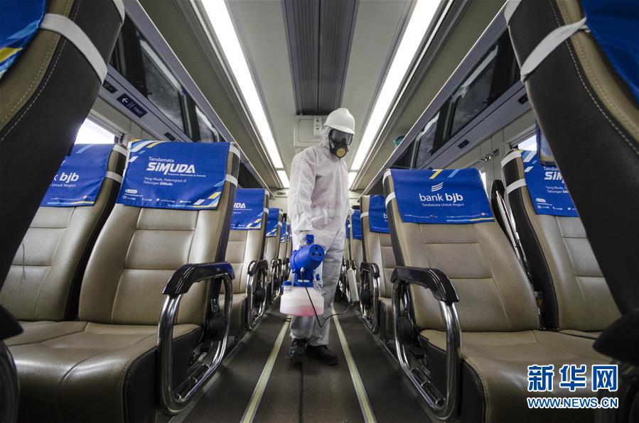 3月15日,在印度尼西亚万隆,一名工作人员在火车车厢内进行消毒。 世界卫生组织15日发布的最新数据显示,全球新冠肺炎病例累计已超过15万,达到152428例。 新华社发(赛普蒂安贾尔 摄)