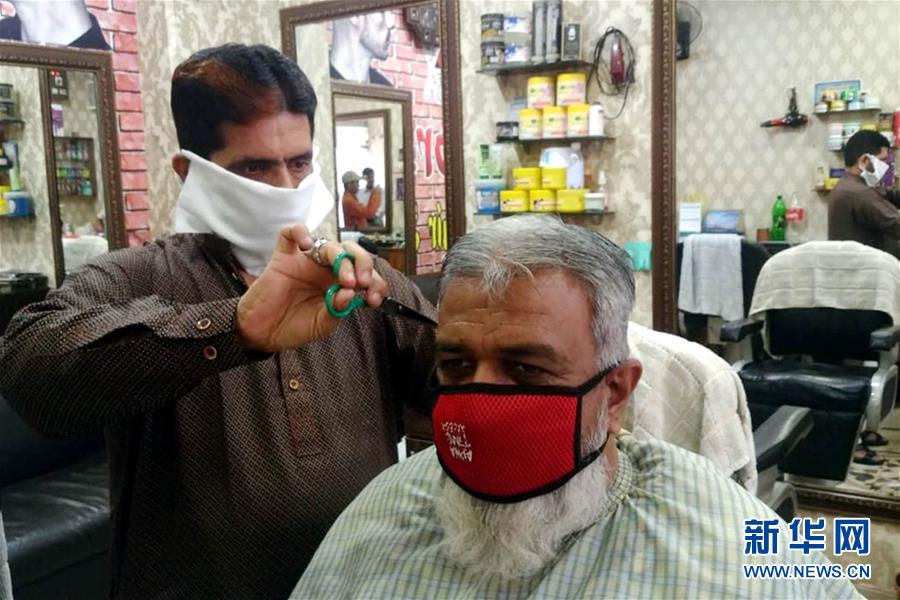 3月15日,在巴基斯坦南部城市卡拉奇,一名戴口罩的顾客在一家理发店理发。 巴基斯坦政府部门15日说,该国当天新增19例新冠肺炎确诊病例,累计确诊病例52例,其中2人治愈出院。 新华社发